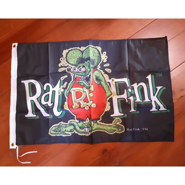 Drapeau nylon avec "Rat Fink" le rat vert du célébre artiste américain "Ed Roth" ou Big Daddy Roth" au centre avec l'inscription "Rat Fink" le tout sur fond noir .